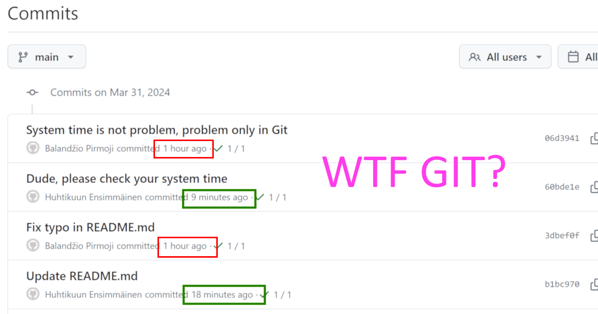 Balandžio Pirmoji was working with Huhtikuun Ensimmäinen when they discovered that Balandžio seemed to have fixed a typo in the README.md 57 minutes before it was introduced by Huhtikuun.